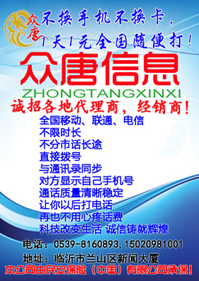 不换手机不换卡,1天1元全国随便打! 保险公司承保,实体店面经营,各大新闻报纸广告支持! 现诚招全国各地代理商,经销商,合作单位! ¥¥¥¥¥¥¥¥¥¥¥¥¥¥¥¥¥¥¥¥¥¥¥ 众唐电子信息服务有限公司成立于2012年,公司投资国际显号线路机房,以先进的文化理念、一流的产品技术、高效的管理团队,打造一流的高清语音通讯节费系统。公司宗旨:“合谐共赢,共创未来。” 产品简介 首先此产品是一款安装在智能手机上节费软件。是基于VOIP技术,集成了SIP网络技术节费省钱的优势及固话网络通信质量高的优势,是目前市场上最好的手机网络电话。 原理:通过手机上网功能,通过此节费手机软件,连接到相应手机号段,实现通话。因此这是与传统的网络电话有明显的区别,通过此软件,无论你是打1分钟电话,还是连续打100分钟电话,使用的网络流量只有固定的1KB。 安装环境:安卓系统的智能手机、苹果手机均可安装使用。 套餐要求:每月5元的30M流量套餐可以拨打15000个电话,接听免费。 优势: 1、一天一元,手机不换,号码不换,长途、市话无限拨打。 2、接通速度快:根据网络质量,直拨模式、回拨模式系统自动选择,在wlan或wifi网络下直拨,接通只需0.1-1秒。 3、显示本机号码。 4、消耗流量小,无论你打电话多长时间,都是1.0KB。 5、使用固话网系统,因此通话质量和手机与固话一样清晰稳定。 6、号码直拨。通过拨号、通话记录、号码薄直接拨打,不需要加拨任何接入号进行转接,从而实现了真正意义上的不用考虑市话、长途,没有了区内、区间、长途的概念。 联系人:孙经理 电话:0539-8160893,15020981001 地址:山东省临沂市兰山区新闻大厦